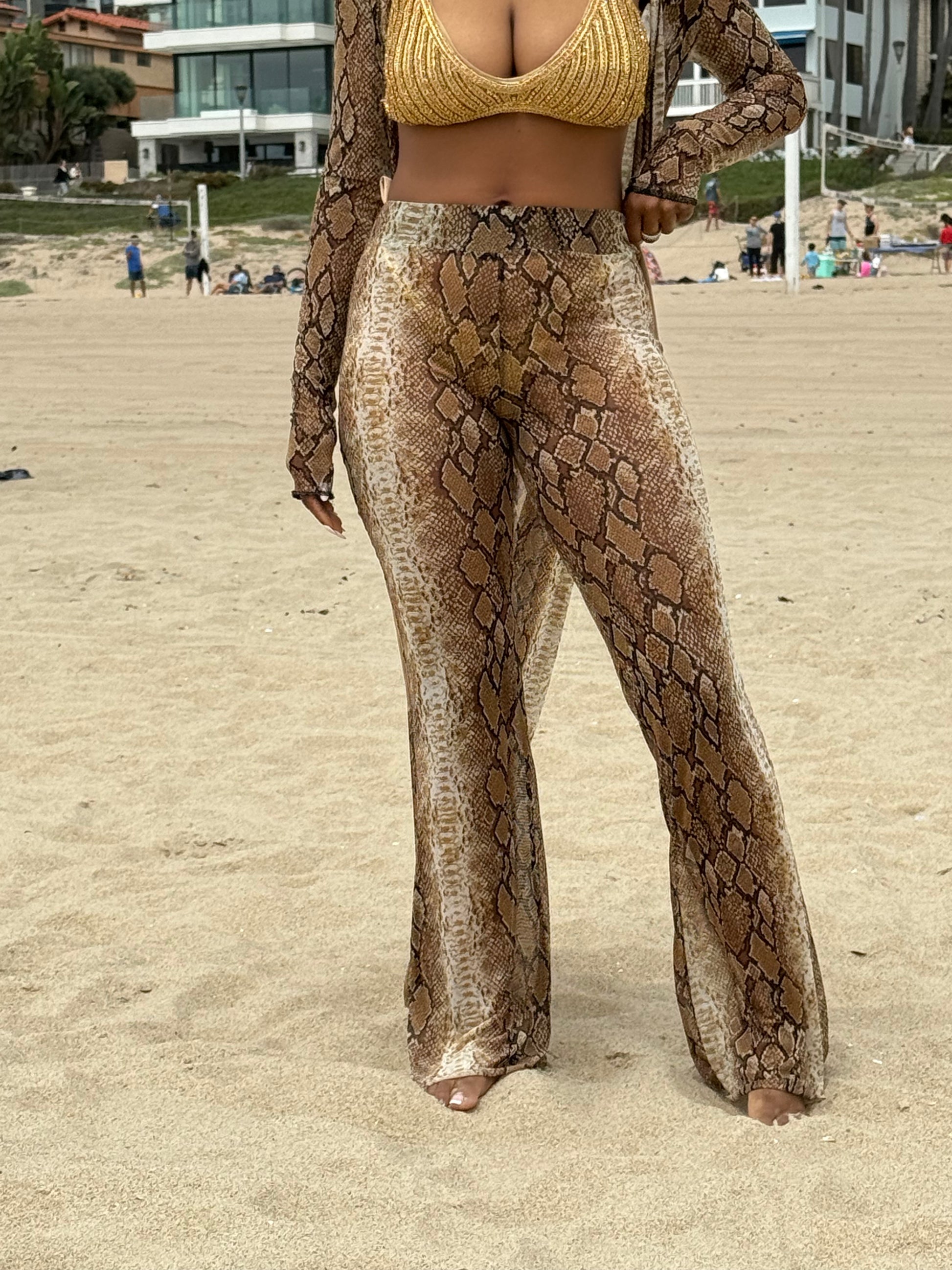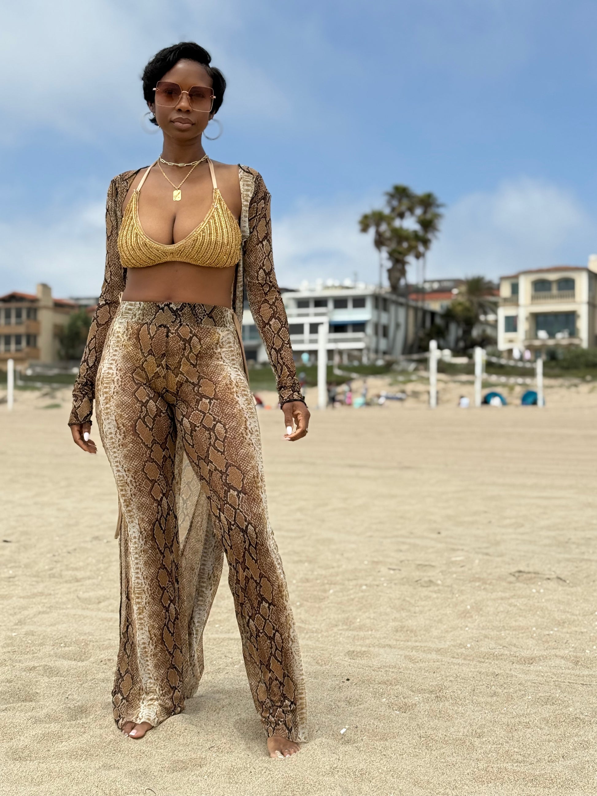 This Snakeskin Cover Up is a stylish addition to your beach or poolside wardrobe. Made with mesh and stretch materials, it effortlessly drapes over your bathing suit for a chic look. The eye-catching snakeskin print adds a touch of exotic flair. Upgrade your swimwear game with this stunning cover up.